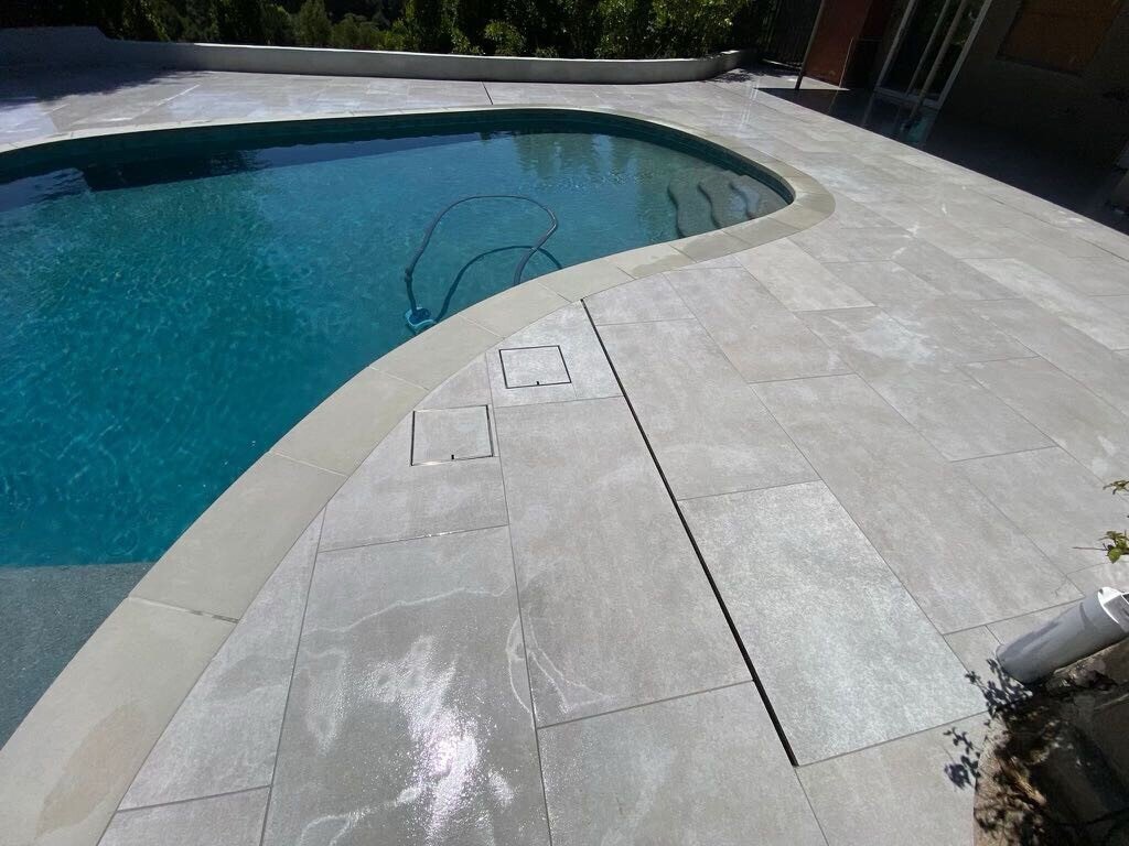 Porcelain pavers are large-format, kiln-fired tiles designed specifically for outdoor use, offering the sleek look of natural stone or tile with superior durability and weather resistance. They are dense, non-porous, and fade-resistant, making them an excellent choice for patios, pool decks, rooftops, and modern outdoor living spaces. Homeowners love porcelain pavers because they’re low-maintenance, slip-resistant, and won’t stain, warp, or absorb moisture — even under intense sun and heat.